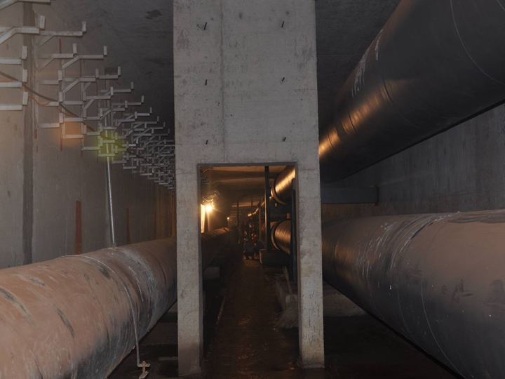 容納的管線較多,包括2根DN1000熱力管道、 1根DN1000給水管道、1根DN900給水管道、弱電管道、220KV、110KV、10KV電力管道及預(yù)留的中水管道、空調(diào)管、直飲水管道等。